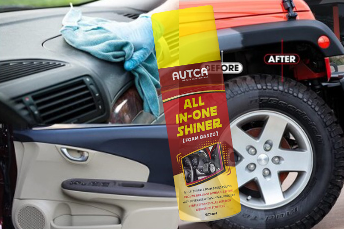 AUTCA All in One Shiner Polish, 3 in 1 Shiner, Multipurpose Foam Spray polish works on dashboards, tyres, vinyl, rubbers, metal etc.